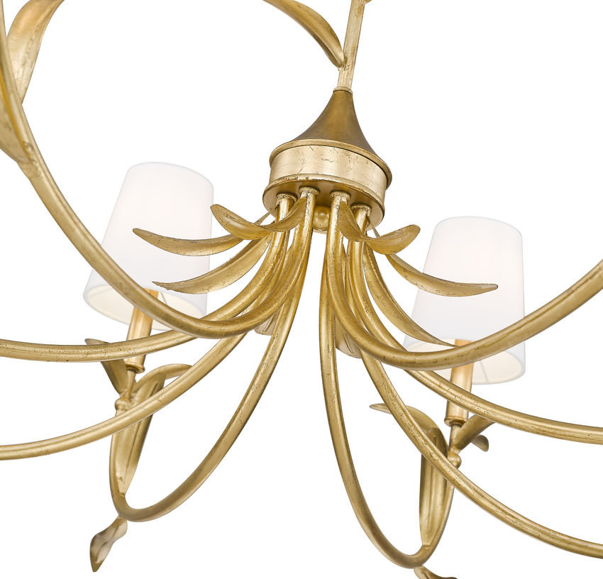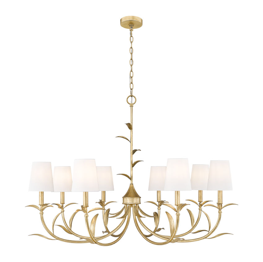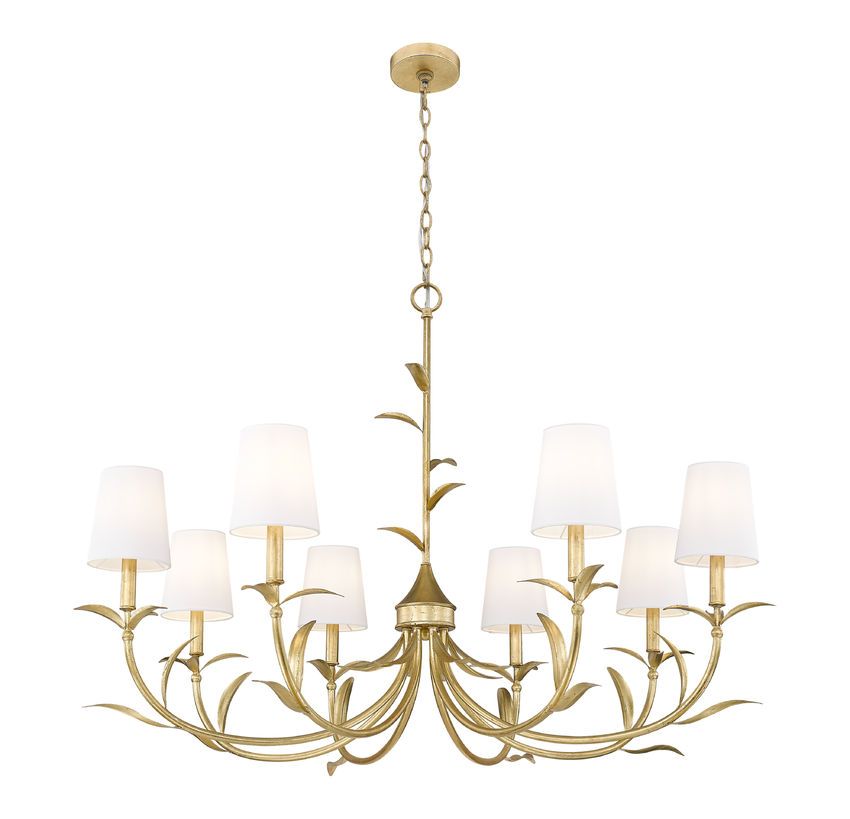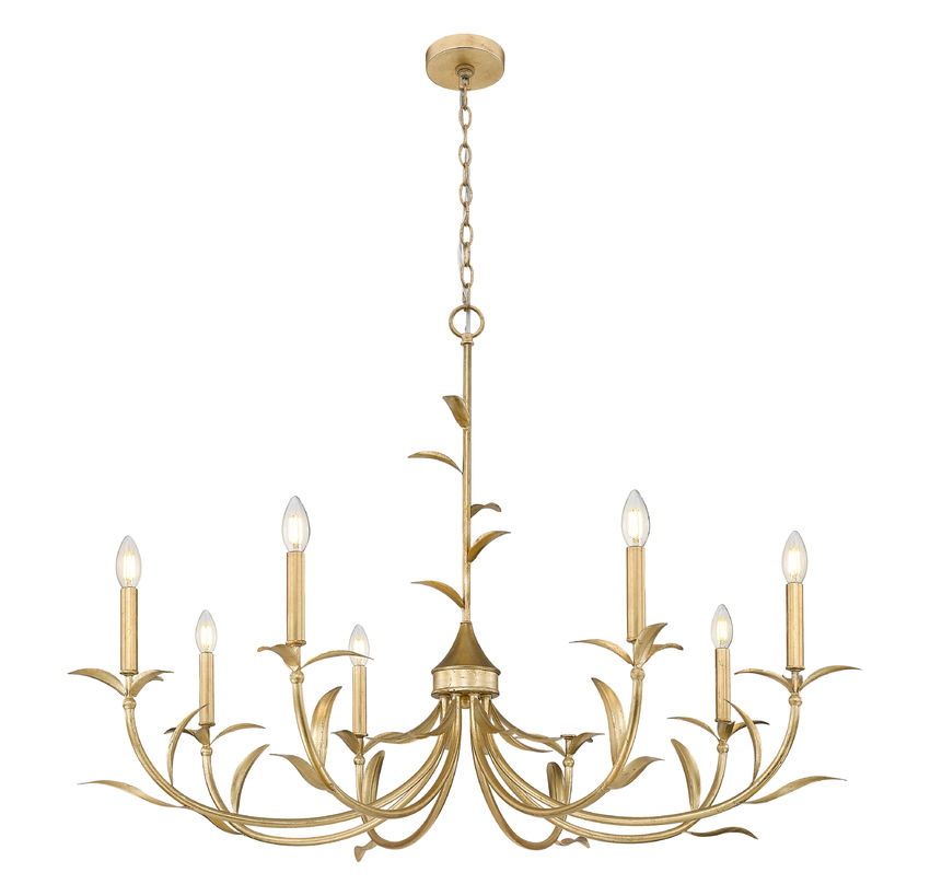 Ultimately elegant lighting takes on a botanical vibe in a chic, sophisticated eight-light chandelier crafted of warm gold leaf finish steel. Artisan flavor delivers exquisite silhouetting with curved arms and delicately shaped fronds, weaving in a natural aesthetic. Smooth holders and candelabra bulb bases make possible dimmable light levels, adding mood illumination to dining rooms, foyers, and large bedrooms.