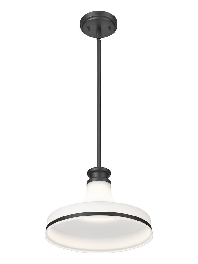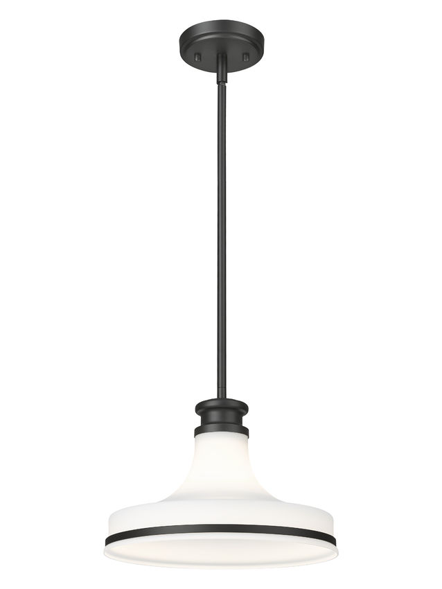 Chic contrast in a standout palette becomes a focal point in a single-light pendant you'll want to explore. Mixing deco, industrial, and artisan, this retro-inspired fixture offers bold matte black framing and a scintillating matte opal glass shapely shade, all coming together to create a visual delight. Highlight dining spaces, kitchens, and foyers with a dimmable fixture blessed with mood-altering variable light levels.