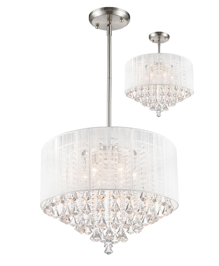The Aura family of linear shaded fixtures feature a stunning double line of multi faceted pyramid crystal. The string shades come in black, silver, and white, while the organza shades come in black and white. Please note: the round shades are only available in black and white and string only shades. In all cases the fixtures are finished with brushed nickel hardware.